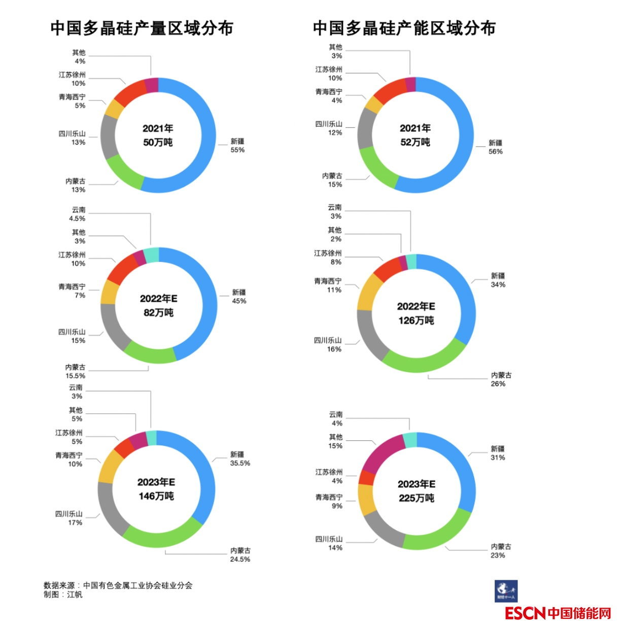 近年來,在產(chǎn)業(yè)配套與優(yōu)惠電價(jià)政策的吸引下,國內(nèi)多晶硅新建項(xiàng)目向內(nèi)蒙古、四川、云南、寧夏等西北、西南地區(qū)轉(zhuǎn)移的趨勢非常明顯,產(chǎn)能、產(chǎn)量增速超出新疆。據(jù)硅業(yè)分會(huì)預(yù)測,2021年底,新疆多晶硅產(chǎn)能的全國占比為56%,這一數(shù)字將在2023年底被稀釋為31%。