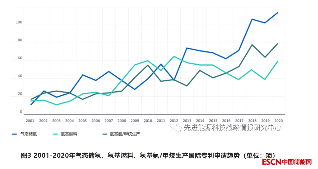 四、2001-2020年,現(xiàn)有儲氫技術(shù)改進(jìn)及氫基氨/甲醇生產(chǎn)技術(shù)專利活動穩(wěn)步增長,但過去10年氫基燃料創(chuàng)新失去了動力