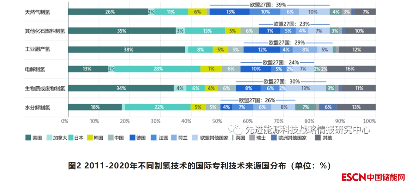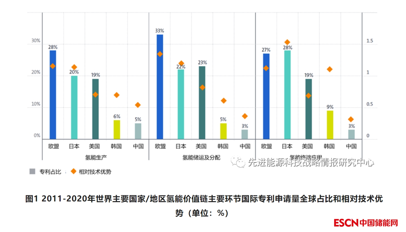 2011-2020年約一半的氫能國際專利與制氫相關(guān),其余分布在氫的存儲、分配、輸運(yùn)和終端應(yīng)用等環(huán)節(jié)。約28%的氫能國際專利由歐洲國家申請,其在三大主要環(huán)節(jié)(氫能生產(chǎn)、儲運(yùn)及分配、終端應(yīng)用)的相對技術(shù)優(yōu)勢(RTA)指數(shù)也領(lǐng)先于其他主要?dú)淠軇?chuàng)新國家(圖1)。日本也具有較強(qiáng)的氫能創(chuàng)新實(shí)力,貢獻(xiàn)了約24%的國際專利,且其增速快于歐洲,兩者的年均復(fù)合增長率分別為6.2%和4.5%。美國貢獻(xiàn)了20%的氫能國際專利,是主要?dú)淠軇?chuàng)新國家中唯一申請量下降的國家。韓國(7%)和中國(4%)國際專利申請數(shù)量有限但穩(wěn)步增長,年均復(fù)合增長率分別達(dá)到12.2%和15.2%。