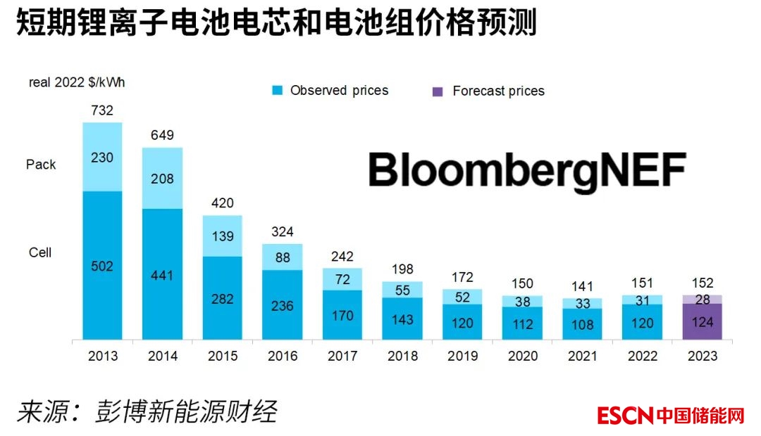 彭博新能源財(cái)經(jīng)對(duì)2023年容量加權(quán)鋰離子電池組價(jià)格的預(yù)測(cè)