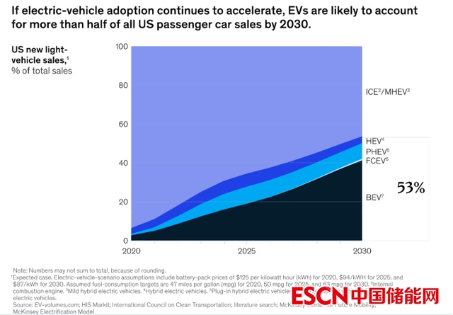 麥肯錫的研究表明(Fischer et al., 2021),在新一屆政府的更多投資(包括拜登總統(tǒng)提出的到2030年美國一半的新車銷售將是零排放汽車的目標)、州一級采用的信貸計劃、更嚴格的排放標準以及美國主要原始設備制造商越來越多的電氣化承諾的推動下,電動汽車的銷售可能會繼續(xù)增加。