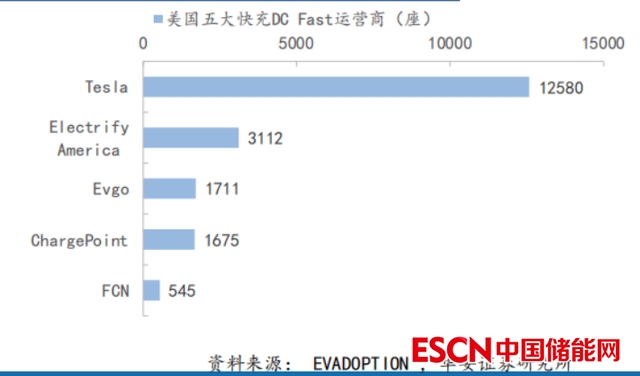 美國充電樁按類型分為AC慢充(包括L1-充電1小時行駛2-5英里和L2-充電1小時行駛10-20英里),和DC快充(充電1小時行駛60英里以上)。目前,AC慢充L2占比為80%,主要運營商ChargePoint貢獻了51.5%的市場份額;而DC快充占比19%,以特斯拉為首,市占率達到了58%。
