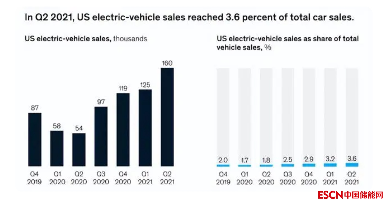 其中,歐洲和中國第四季度的銷量分別比上一季度增長了60%和80%,推動全球電動車普及率達到了6%的歷史新高。雖然美國落后于其他兩個地區(qū),但在2020年第二季度和2021年第二季度之間,電動車銷量增長了近200%,有助于在大流行期間實現(xiàn)3.6%的國內(nèi)滲透率(見圖1)。