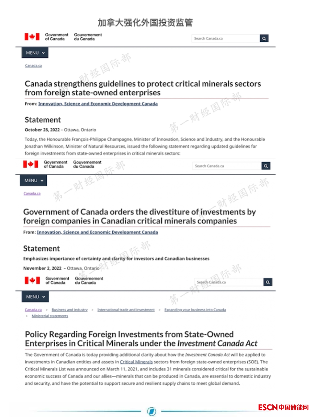 第一財(cái)經(jīng)記者看到,加拿大政府在網(wǎng)站上更新了在此方面的政策,其中就如何將《加拿大投資法》適用于外國(guó)國(guó)有企業(yè) (SOE) 對(duì)加拿大實(shí)體和關(guān)鍵礦產(chǎn)部門資產(chǎn)的投資提供了進(jìn)一步的明確說明。