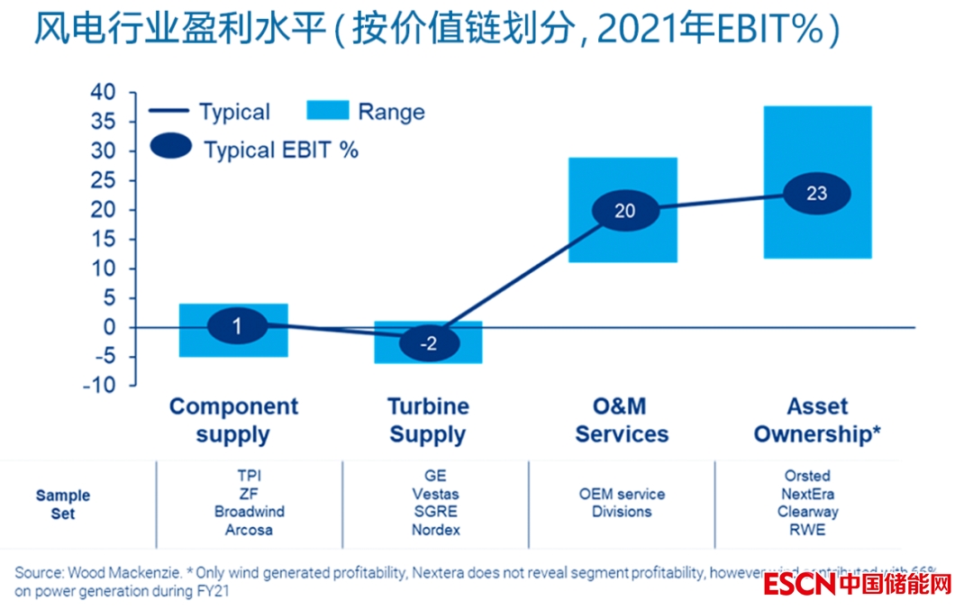 在售電和項(xiàng)目投資的推動(dòng)下,項(xiàng)目業(yè)主在整個(gè)價(jià)值鏈中的息稅前利潤(rùn)率平均水平最高。許多全球風(fēng)電大項(xiàng)目業(yè)主也專注于運(yùn)維領(lǐng)域的利潤(rùn)率擴(kuò)張,因?yàn)樗麄兇怪闭狭似煜虏粩嘣鲩L(zhǎng)的風(fēng)電資產(chǎn)的服務(wù)。