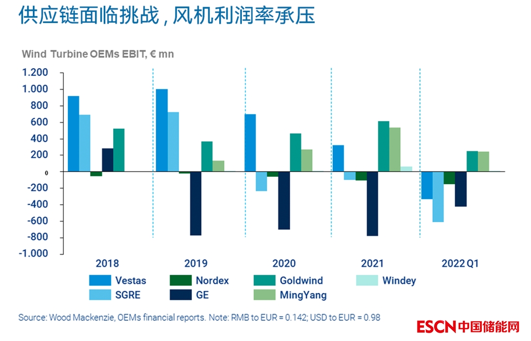 能源價(jià)格通脹、專業(yè)物流成本飛漲、人工成本暴漲、疫情引起的延誤依舊存在,現(xiàn)又加上了激進(jìn)的電價(jià)招標(biāo)帶來的壓力。因此,西方風(fēng)機(jī)整機(jī)商在過去兩年中虧損超過34億歐元,僅在2022年第一季度就損失近15億歐元。