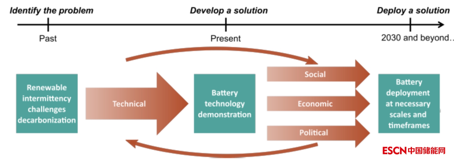 根據國際能源署的預測,到2030年,二氧化碳排放量的大部分減少將來自當今市場上已經部署或上市的技術,到2050年,大約一半的碳減排量將依賴于目前處于示范或原型階段的能源技術。因此,政府和社會在技術上正走在應對氣候變化的正確道路上。然而,還有許多其他潛在的社會、經濟和政治障礙需要克服,以確保以足夠快的速度部署最佳能源技術,以使這些減少的幅度足以防止更大規(guī)模的損害(圖1)。雖然這些考慮因素并不獨立于技術方面,但它們可能需要不同的方法和解決方案。這項工作探討了在更廣泛的電池部署中的兩個關鍵挑戰(zhàn):電池成本和材料限制。一系列具有合適性能特征的電池技術已經存在,但高昂的前期成本可能會延遲或阻礙更廣泛的采用,特別是在目前的低生產規(guī)模下。最后,即使特定的電池技術滿足必要的成本和性能指標,其關鍵元件的可用性和供應鏈也可能會阻礙快速和深度集成。因此,必須盡快解決這些問題,以實現(xiàn)關鍵的脫碳目標。這項工作探討了克服或規(guī)避這些障礙的經濟和政治策略。