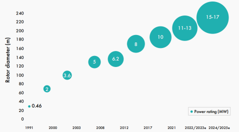圖4 海上風(fēng)電機(jī)組單機(jī)容量增長(zhǎng)情況