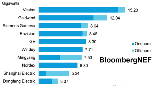 據(jù)BNEF數(shù)據(jù),在2021年全球海上風(fēng)電整機(jī)商排名中,上海電氣、明陽(yáng)智能,金風(fēng)科技和中國(guó)海裝占據(jù)了全球海上風(fēng)電整機(jī)制造廠商前四名位置,其中上海電氣位居第一。