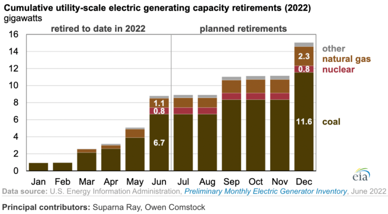 美國運(yùn)營商計(jì)劃在2022年退役15.1 吉瓦發(fā)電容量,超過一半(8.8 吉瓦)在今年上半年退役。燃煤發(fā)電廠將占今年退役容量的76%,其次是天然氣(12%)和核能(9%)。2022年,美國退役的燃煤發(fā)電廠包括俄亥俄州1305兆瓦的William H.Zimmer發(fā)電廠(5月退役),以及馬里蘭州1205兆瓦M(jìn)organtown發(fā)電站(6月退役)。此外,密歇根州的769兆瓦帕利塞德斯核電站于6月退役。