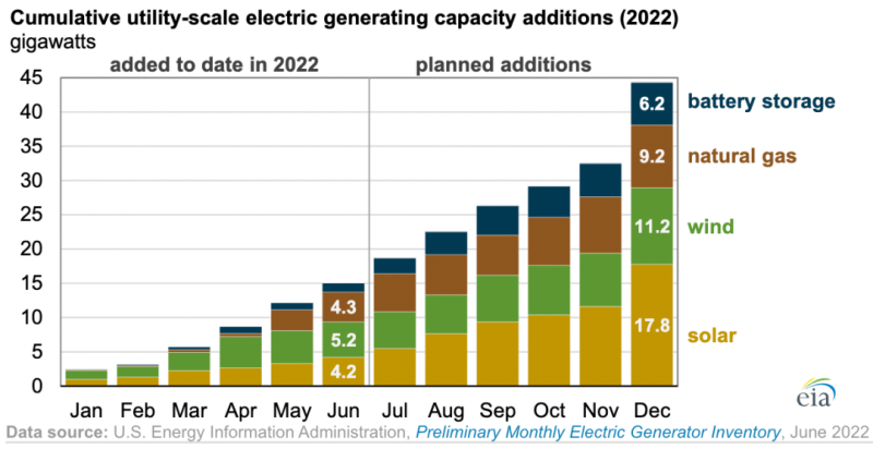 中國儲(chǔ)能網(wǎng)訊:根據(jù)美國能源信息署的數(shù)據(jù), 2022年上半年,美國新的公用事業(yè)規(guī)模發(fā)電裝機(jī)容量達(dá)到了15吉瓦,今年下半年可能再新增29吉瓦的容量。