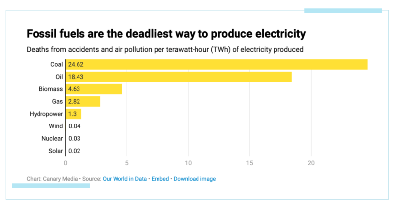 中國(guó)儲(chǔ)能網(wǎng)訊:我們說(shuō)化石燃料是致命的,這不僅僅是因?yàn)樗鼈儗?dǎo)致了氣候危機(jī)。每單位發(fā)電量中,煤炭和石油造成的死亡人數(shù)遠(yuǎn)遠(yuǎn)超過(guò)可再生能源或核能——這只是計(jì)算空氣污染和事故造成的死亡人數(shù),而沒(méi)有計(jì)入氣候變化引發(fā)的災(zāi)害造成的死亡人數(shù)。