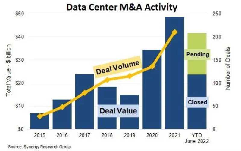 中國儲能網(wǎng)訊:Synergy Research Group 的新數(shù)據(jù)顯示,今年前6個月完成了87筆以數(shù)據(jù)中心為導(dǎo)向的并購交易,總價值為240億美元,另外還有180億美元的未決交易已達成一致,但尚未正式關(guān)閉,其中大部分預(yù)計將在年底前關(guān)閉。加上幾乎沒有提前公布的常規(guī)交易,2022年的并購活動將達到去年的創(chuàng)紀錄水平。