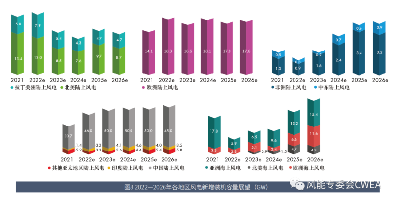 圖8 2022—2026年各地區(qū)風電新增裝機容量展望(GW)