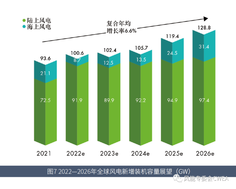 具體來說,2022―2026年全球陸上風電有望新增裝機466GW,年均新增93.3GW,復(fù)合年均增長率將達到6.1%。