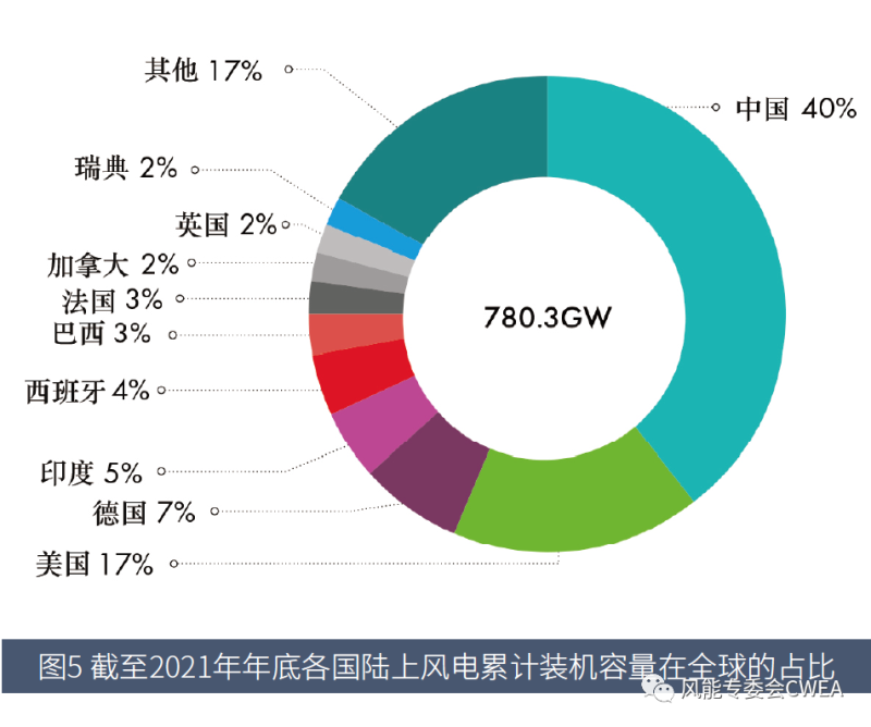 圖5 截至2021年年底各國陸上風電累計裝機容量在全球的占比