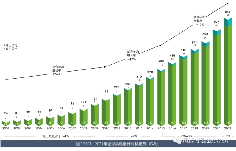 圖2 2001—2021年全球風電累計裝機走勢(GW)