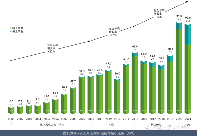 雖然2021年全球陸上風電市場發(fā)展勢頭有所減弱,但72.5GW的新增裝機容量仍為歷史第二高水平。全年海上風電新增裝機容量超過21GW,是上一年的3倍多,創(chuàng)下歷史新高。