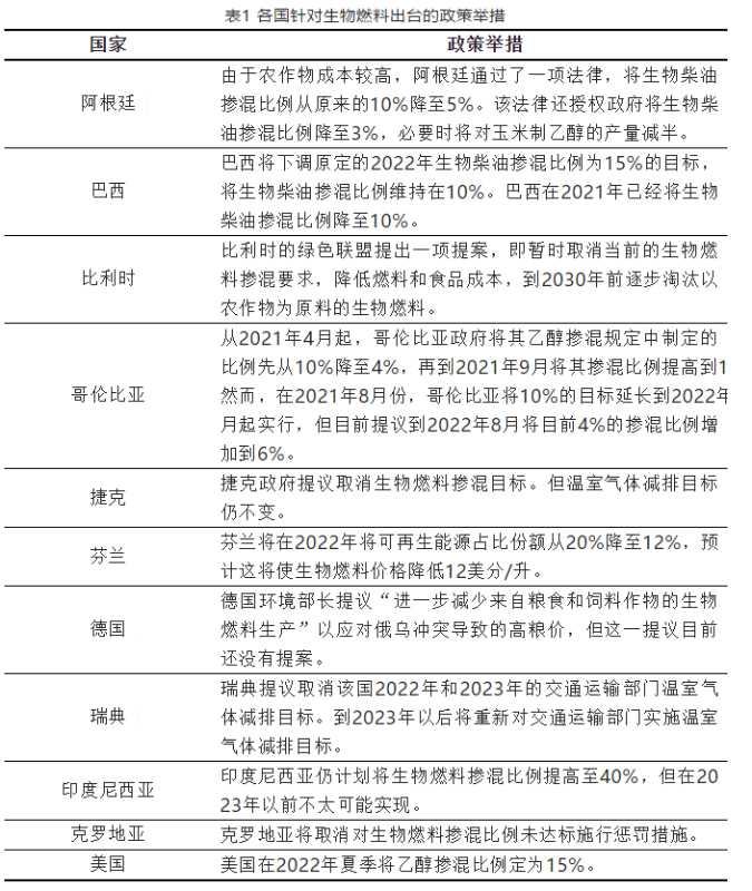 (3)在政策制定方面。2022年,10個國家的政府機構(gòu)已經(jīng)或正在提議放寬、推遲或延緩生物燃料摻混比例要求或溫室氣體配額。這些政策決定的既定理由是降低消費者或政府承擔(dān)的額外燃料成本。如果價格持續(xù)保持高位運行,生物柴油和可再生柴油的價格將承受最大的壓力。此外,食品安全也是許多政府的首要任務(wù),但迄今為止,只有比利時和德國正在考慮放寬生物燃料的要求以解決這一問題。中國已警告乙醇生產(chǎn)商,將“嚴(yán)格控制以玉米為原料的燃料乙醇加工”,歐盟委員會也表示將支持成員國以糧食安全為名降低燃料乙醇的摻混比例。然而,預(yù)計各國政府在考慮降低要求時會謹(jǐn)慎行事。這是因為生物燃料需求的任何減少都伴隨著石油交付和溫室氣體排放的增加,這與大多數(shù)以發(fā)展生物燃料為優(yōu)先事項的國家政策背道而馳。為應(yīng)對高油價和原材料上漲的壓力,多個國家針對生物燃料出臺了多項政策,如表1所示。