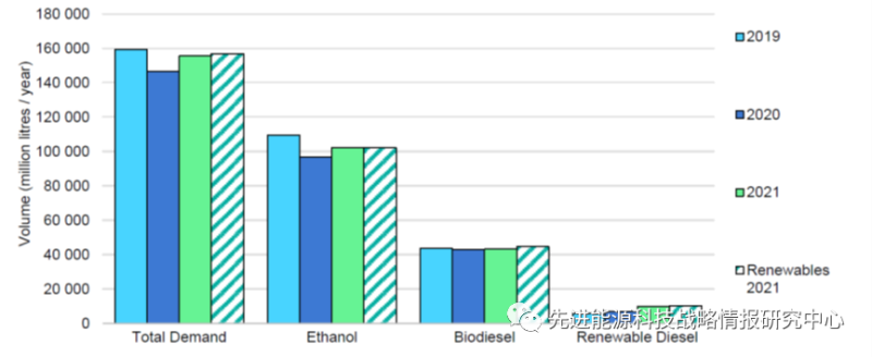 圖3 2019-2021年按燃料類型劃分的生物燃料需求實際值與《可再生能源2021》預(yù)測結(jié)果對比(單位:百萬升/年)