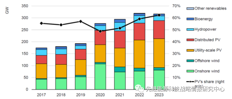 圖2 到2023年按能源種類劃分的可再生能源新增裝機容量預(yù)測(左軸單位:吉瓦;右軸光伏占比)