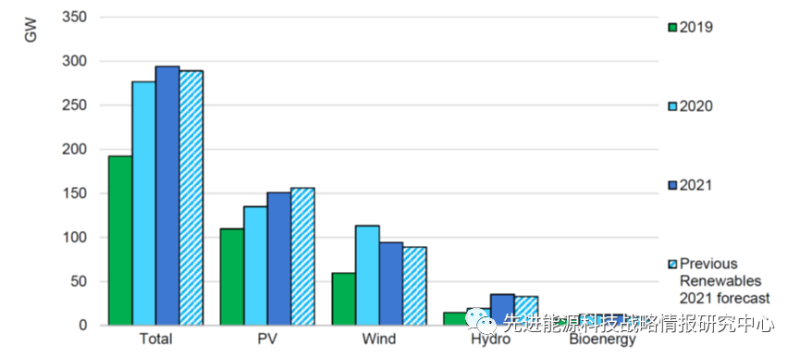 圖1 2019-2021年全球可再生能源新增裝機容量實際值與《可再生能源2021》預(yù)測結(jié)果對比(單位:吉瓦)