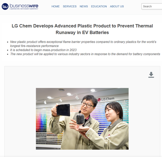 LG 化學(xué)說稱,與一般的阻燃塑料相比,這種新材料由于具有出色的耐熱性,在應(yīng)用于電動(dòng)汽車的電池組蓋時(shí)可以阻擋更長時(shí)間的熱量。
