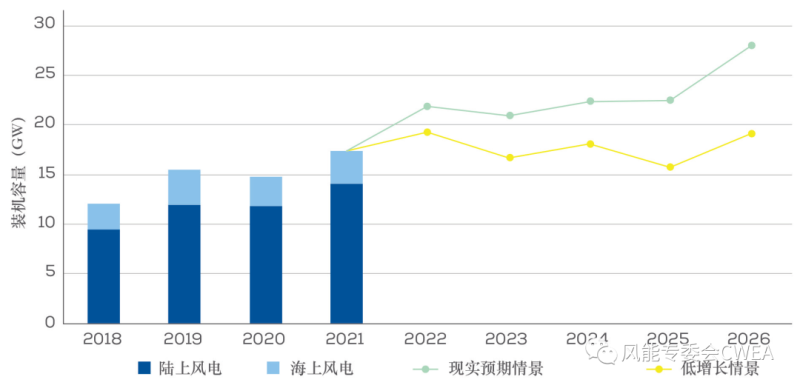 現(xiàn)實(shí)預(yù)期情景(Realistic Expectations Scenario)假定各國(guó)政府將落實(shí)其作出的加快新風(fēng)電場(chǎng)開(kāi)發(fā)的政策承諾,如德國(guó)政府的新政策要求為風(fēng)電項(xiàng)目提供更多土地。在此情景下,2022―2026年歐洲將合計(jì)新增風(fēng)電裝機(jī)116GW,年均新增23.1GW。其中,歐盟將年均新增17.6GW,遠(yuǎn)低于為達(dá)成可再生能源占比40%的目標(biāo)所需的年均新增裝機(jī)規(guī)?!?2GW。