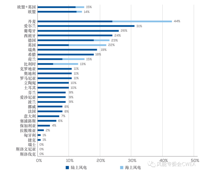 就風(fēng)電在各國(guó)電力消費(fèi)中的占比而言,共有15個(gè)國(guó)家高于10%。丹麥?zhǔn)亲罡叩?,達(dá)到44%;愛(ài)爾蘭和葡萄牙分別為31%、26%;西班牙(24%)、德國(guó)(23%)、英國(guó)(22%)居于其后。