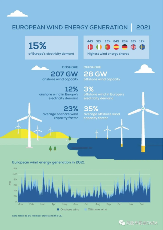 2021年,歐盟和英國(guó)的風(fēng)電場(chǎng)共發(fā)電437TWh,滿足了這些國(guó)家15%的全社會(huì)電力需求,比2020年下降1.4個(gè)百分點(diǎn),與2019年基本相當(dāng)。