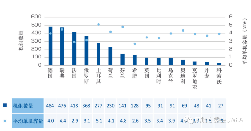 圖6 2021年歐洲新安裝陸上風(fēng)電機(jī)組的數(shù)量與平均單機(jī)容量