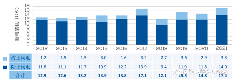2021年,在審批流程以及全球供應(yīng)鏈等問(wèn)題持續(xù)拖累新建風(fēng)電場(chǎng)并網(wǎng)的不利形勢(shì)下,歐洲新增風(fēng)電裝機(jī)17.4GW(陸上風(fēng)電為14GW,海上風(fēng)電為3.4GW),同比增長(zhǎng)18%,超過(guò)了歷史最好水平?2017年的17.1GW。然而,這依然比歐洲風(fēng)能協(xié)會(huì)在2021年2月給出的預(yù)測(cè)值低了11%,也不足歐洲實(shí)現(xiàn)2030年能源與氣候目標(biāo)所需的年度裝機(jī)規(guī)模。要想到2030年讓可再生能源在歐盟能源結(jié)構(gòu)中的占比達(dá)到40%,期間的風(fēng)電年均新增裝機(jī)容量不能低于32GW。