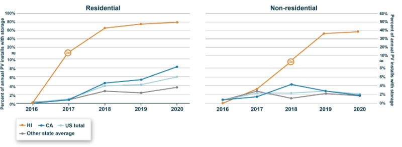住宅太陽(yáng)能發(fā)電設(shè)施配套部署儲(chǔ)能系統(tǒng)的比例一直在穩(wěn)步增長(zhǎng),但仍占市場(chǎng)的一小部分,占2020年安裝的美國(guó)住宅太陽(yáng)能發(fā)電設(shè)施系統(tǒng)的6%(如圖11所示)。而在非住宅市場(chǎng),2020年安裝的太陽(yáng)能發(fā)電設(shè)施系統(tǒng)中只有2%配套部署儲(chǔ)能系統(tǒng),因?yàn)檫@些客戶(hù)更有可能獨(dú)立部署電池儲(chǔ)能系統(tǒng)。在住宅和非住宅市場(chǎng)中,夏威夷州因其凈計(jì)量改革而獨(dú)樹(shù)一幟,激勵(lì)更多的太陽(yáng)能發(fā)電設(shè)施配套部署儲(chǔ)能系統(tǒng)。加利福尼亞州的住宅客戶(hù)可能會(huì)通過(guò)為防止森林火災(zāi)風(fēng)險(xiǎn)而實(shí)施的斷電以及該州政府的激勵(lì)措施來(lái)增加電池儲(chǔ)能系統(tǒng)的部署。