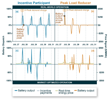 太陽(yáng)能+儲(chǔ)能項(xiàng)目的行為模型通常假設(shè)項(xiàng)目運(yùn)營(yíng)商優(yōu)化電池儲(chǔ)能系統(tǒng)使用以獲得批發(fā)市場(chǎng)收入。但在研究美國(guó)各地混合工廠的經(jīng)驗(yàn)調(diào)度數(shù)據(jù)之后,發(fā)現(xiàn)只有少數(shù)在2020年運(yùn)營(yíng)的太陽(yáng)能+儲(chǔ)能項(xiàng)目主要關(guān)注批發(fā)市場(chǎng)的價(jià)格信號(hào)。與其相反,特殊儲(chǔ)能激勵(lì)計(jì)劃(如SMART)的參與者關(guān)注激勵(lì)支付的時(shí)間(見(jiàn)圖a),負(fù)荷服務(wù)實(shí)體試圖減少其對(duì)容量和輸電需求費(fèi)用的風(fēng)險(xiǎn)(圖b),以及能源消費(fèi)者優(yōu)先考慮彈性和公用事業(yè)賬單的最小化。這些替代商業(yè)模式可以為太陽(yáng)能+儲(chǔ)能項(xiàng)目運(yùn)營(yíng)商帶來(lái)更高的收入,但不能從電網(wǎng)的角度優(yōu)化儲(chǔ)能調(diào)度,并且有時(shí)將會(huì)阻礙電網(wǎng)收益。