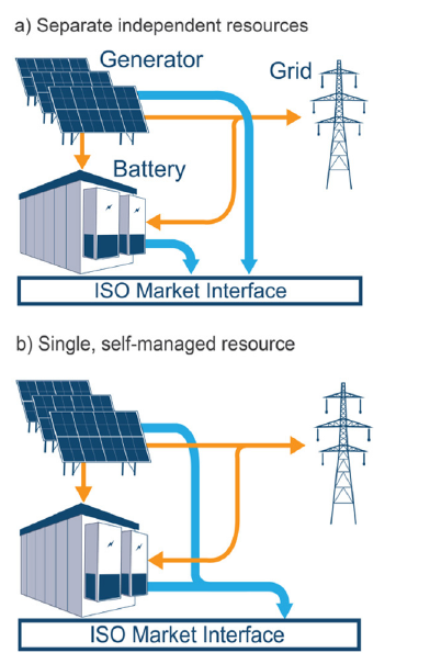 混合部署項(xiàng)目可以作為單一的、完全集成的資源或單獨(dú)但位于同一地點(diǎn)的資源與批發(fā)電力市場(chǎng)交互。作為一種綜合資源,混合項(xiàng)目運(yùn)營(yíng)商在開(kāi)發(fā)市場(chǎng)投標(biāo)時(shí)必須預(yù)測(cè)風(fēng)力發(fā)電量或太陽(yáng)能發(fā)電量,并管理其配套的電池儲(chǔ)能系統(tǒng)。作為單獨(dú)的資源進(jìn)行管理,批發(fā)市場(chǎng)運(yùn)營(yíng)商將實(shí)施方法來(lái)管理電池儲(chǔ)能系統(tǒng)的調(diào)度和風(fēng)力發(fā)或太陽(yáng)能發(fā)電的可變性,同時(shí)考慮任何耦合約束。