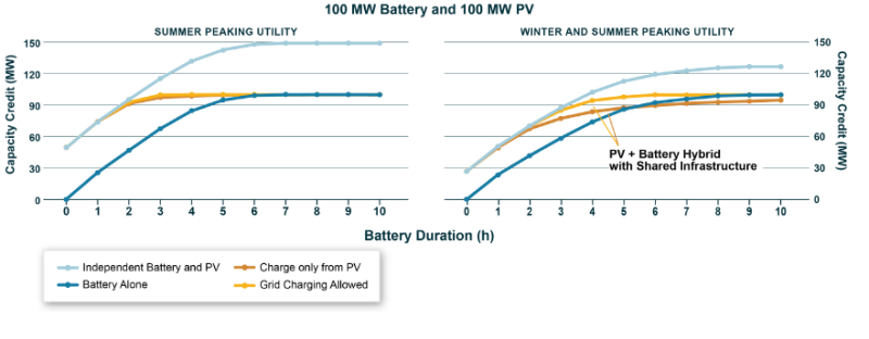 圖8.不同持續(xù)時(shí)間的電池儲(chǔ)能系統(tǒng)、太陽(yáng)能發(fā)電設(shè)施和混合部署項(xiàng)目之間的容量信用比較