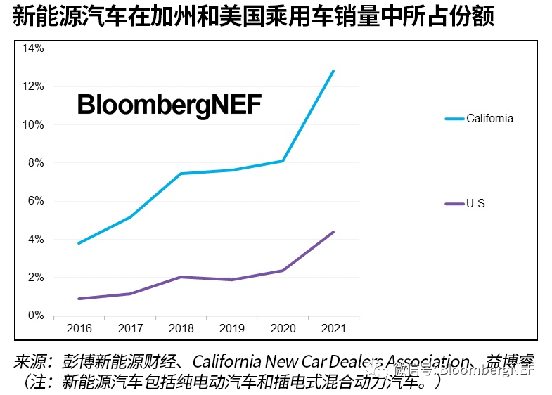 該州在2020年秋季設(shè)定了于2035年淘汰內(nèi)燃機(jī)(ICE)汽車的目標(biāo)。彭博新能源財(cái)經(jīng)當(dāng)時(shí)預(yù)計(jì),為保證按規(guī)劃淘汰內(nèi)燃機(jī)汽車,加州2021年新能源汽車銷售份額須達(dá)到10%左右。車企最初對(duì)2035年目標(biāo)持猶豫態(tài)度,但之后一些公司已設(shè)定了自己的內(nèi)燃機(jī)淘汰目標(biāo),值得一提的是通用汽車公司、福特汽車、大眾汽車和本田汽車。