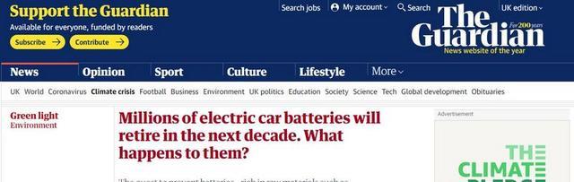 英國(guó)《衛(wèi)報(bào)》報(bào)道截圖 據(jù)估計(jì),至2030年,預(yù)計(jì)將有超過(guò)1200萬(wàn)噸鋰離子電池“退休”。這些電池生產(chǎn)需要大量的鋰、鎳和鈷等原材料,這些原材料的開(kāi)采會(huì)對(duì)氣候、環(huán)境以及勞工權(quán)利產(chǎn)生影響,同時(shí),當(dāng)這些電池超過(guò)使用壽命,還可能變成堆積如山的電子垃圾。
