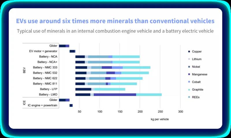 所以,我們回溯5月份IEA寫的電池資源約束報(bào)告《The Role of Critical Minerals in Clean Energy Transitions》,詳細(xì)敘述了上端鋰、鎳、鈷還有稀土都制約著電動(dòng)汽車大發(fā)展。