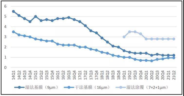 回顧過往,隔膜價格自2014年一路下跌,在2019年之后,隨著新能源汽車行業(yè)發(fā)展,隔膜需求增加,價格下跌趨勢終止,處于低位徘徊。