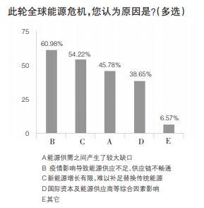 調(diào)查結(jié)果顯示,此輪能源危機,244人認(rèn)為能源供需之間產(chǎn)生了較大缺口,占比45.78%;325人認(rèn)為疫情影響導(dǎo)致能源供應(yīng)不足、供應(yīng)鏈不暢通,占比60.98%;289人認(rèn)為新能源增長有限,難以補足替換傳統(tǒng)能源,占比54.22%;206人認(rèn)為受國際資本及能源供應(yīng)商等綜合因素影響,占比38.65%;35人認(rèn)為受其他因素影響,占比6.57%。