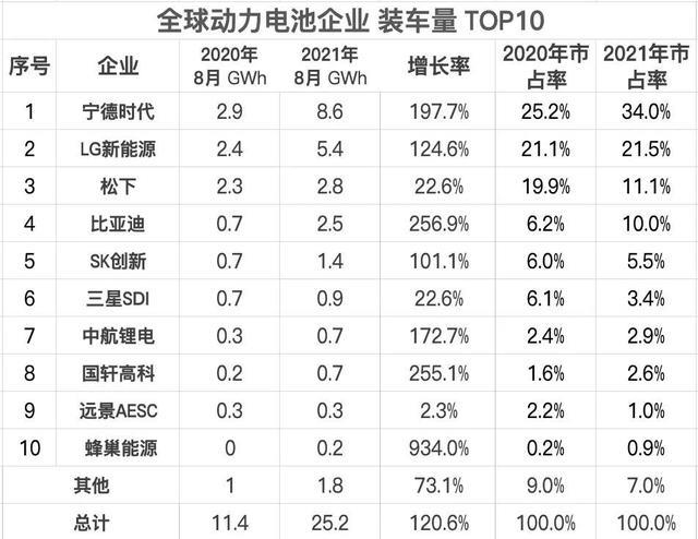 寧德時代一枝獨秀,8月裝車量為8.6GWh,全球市占率高達34.0%,同比提升8.8個百分點。