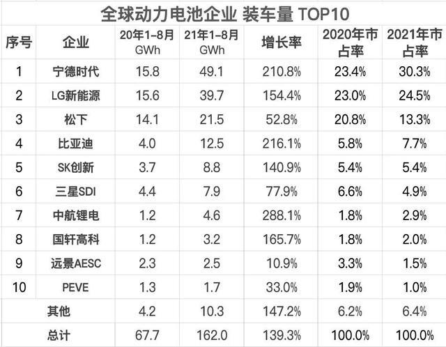 1-8月,中國企業(yè)的市占率隨本土新能源汽車產業(yè)的快速發(fā)展,進一步提升,其中,寧德時代以30.3%居首,比亞迪以7.7%位居全球第4位。