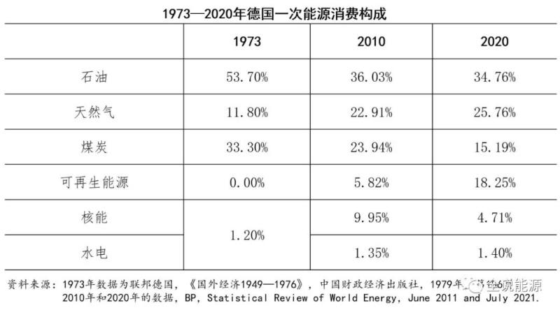 將時間線拉長,就在實現(xiàn)碳達峰時的1973年,當時的聯(lián)邦德國,即我們通常所稱的西德一次能源消費結構中,石油、煤炭和天然氣是絕對主體,還沒有可再生能源的統(tǒng)計數(shù)字。正式提出能源轉型的2010年,石油、煤炭和天然氣仍是德國能源消費的絕對主體,核能排在第四的位置,可再生能源排名第五。到了2020年,可再生能源排名雖然上升到了第三位,但石油、煤炭和天然氣三大化石能源仍占據(jù)著德國一次能源消費的主體地位,與2010年對比,可再生能源搶占的更多是煤炭和核能的市場份額。