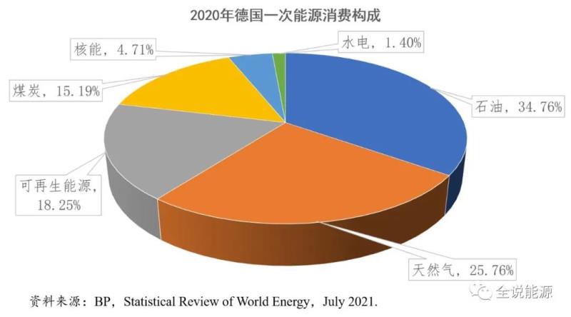 具體細分,德國的能源消費高度依賴傳統(tǒng)的化石能源。2020年,德國一次能源消費結構中,石油是第一大能源來源,占比34.76%;天然氣第二,占比25.76%;可再生能源第三,占比18.25%;煤炭第四,占比15.19%;核能第五,占比4.71%;水電第六,占比1.4%。