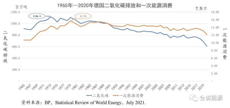 從統(tǒng)計數(shù)字看,德國能源消費產(chǎn)生的二氧化碳排放量最高的年份,是49年前的1973年,為11.164億噸,自此之后就再也沒有超過這個數(shù)字。因此,可以說,早在約50年前德國就已經(jīng)實現(xiàn)了碳達峰,德國能源消費的二氧化碳達峰,與后來逐漸大熱的氣候問題和減排,沒有任何直接的關系。