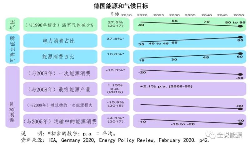 綜合上述有關文件,為了實現(xiàn)能源轉型,德國政府計劃,以2008年為基準,2020年德國一次能源消費要下降20%,2050年要下降50%;以1990年為基準,2020年德國溫室氣體排放要下降40%,2030年要下降55%,2050年要下降80-95%;來源于可再生能源的發(fā)電,2020年至少要達到35%,2030年要達到50%,2040年要達到65%,2050年要達到80%。