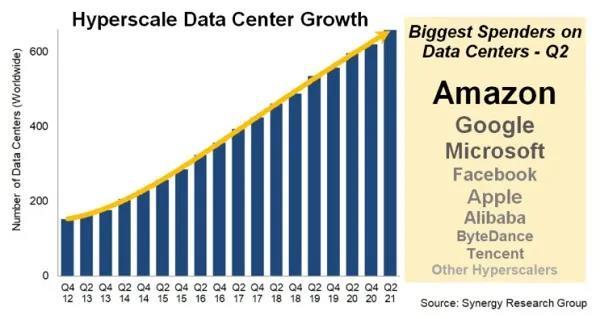 Synergy Research的新數(shù)據(jù)顯示,截至2021年第二季度末,超大規(guī)模提供商(Hyperscale Providers)運(yùn)營(yíng)的大型數(shù)據(jù)中心總數(shù)增加到659個(gè),相比2016年同期增加一倍多。在所處位置方面,美國(guó)和中國(guó)繼續(xù)占主要云和互聯(lián)網(wǎng)數(shù)據(jù)中心站點(diǎn)的一半以上。緊隨其后的是日本、德國(guó)、英國(guó)、澳大利亞、加拿大、愛(ài)爾蘭和印度,它們合計(jì)占總數(shù)的25%。