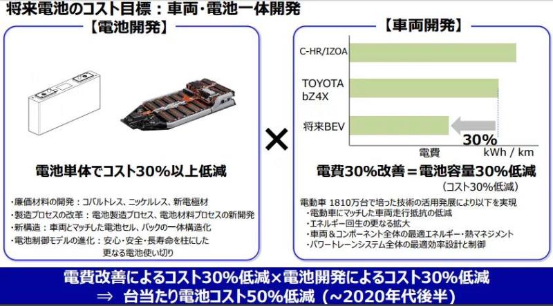 為了推廣純電動汽車,降成本是關(guān)鍵。豐田希望通過對車輛與電池的一體化研發(fā),在2030年前將每輛車的電池成本降低50%。具體而言,通過開發(fā)無鈷、無鎳等更廉價的材料,改革制造流程與電池結(jié)構(gòu)等,將單個電池成本降低30%以上;通過車輛熱管理、效率控制、減少阻力等方式,逐步將每公里的耗電量減少30%以上,相當于縮減30%的電池容量,從而削減30%的成本。也就是說,電池和車輛兩個層面的降本效果疊加起來,最終使得每輛車的電池成本降低50%。