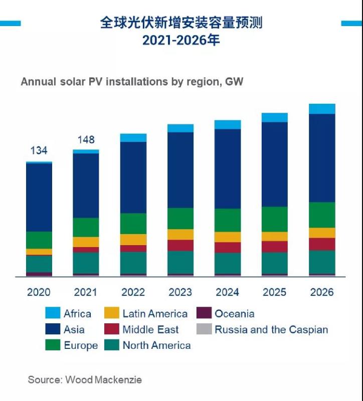 據(jù)伍德麥肯茲最新預測,2021年將繼續(xù)蓬勃發(fā)展,預計安裝容量將實現(xiàn)148 GW,同比增長11%。未來五年的復合年均增長率為7%。2026年度新增容量或?qū)⑼黄?00GW大關,而距離2019年突破首個100GW年度增量大關僅耗時7年。